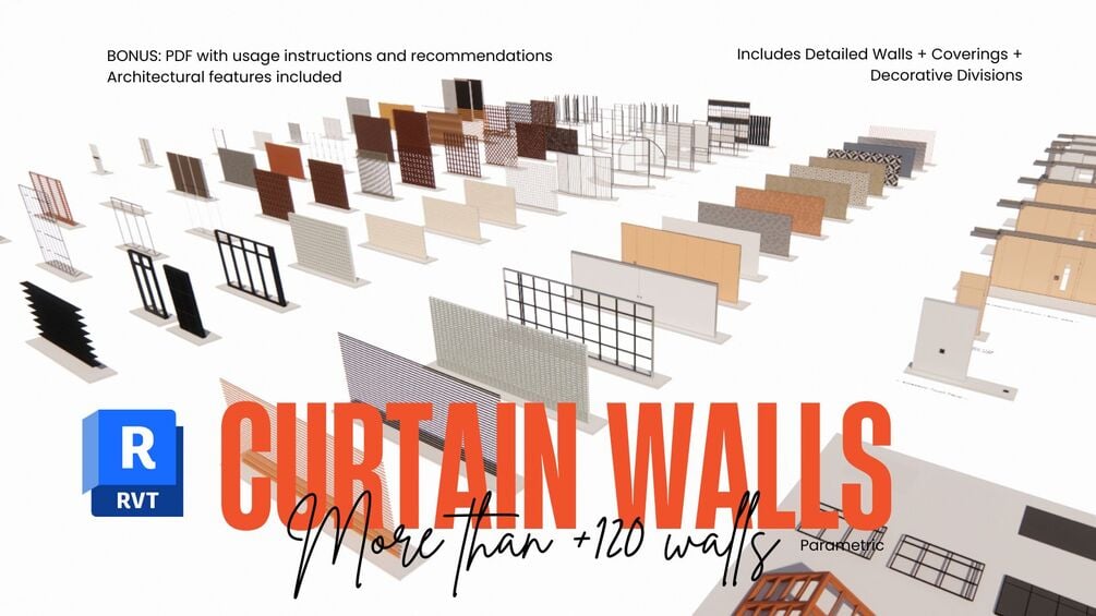 - +120 Parametric Curtain Walls, Dedicated Walls, and Decorative Walls that you can customize and use in any type of project.